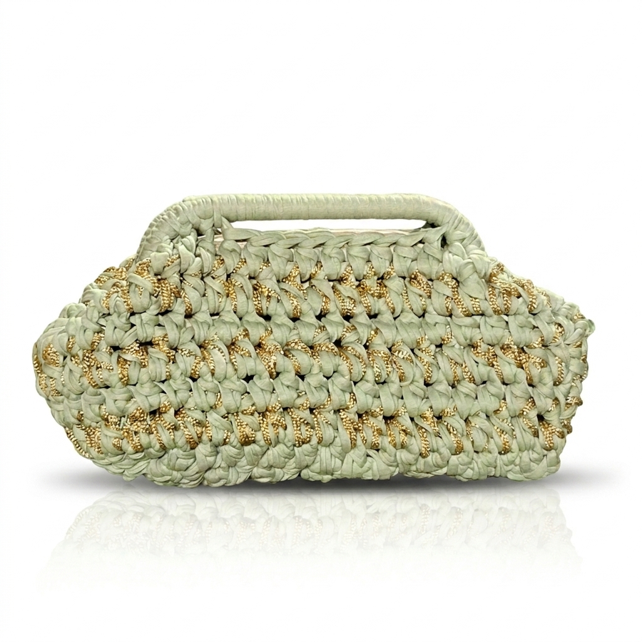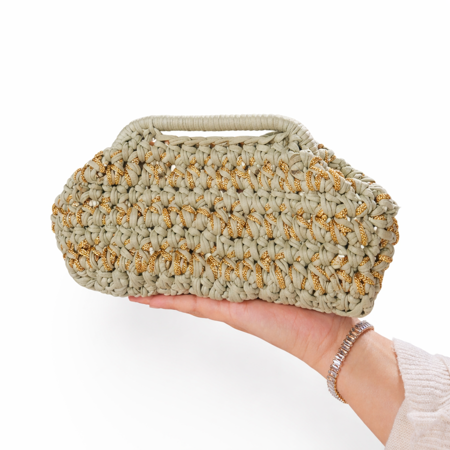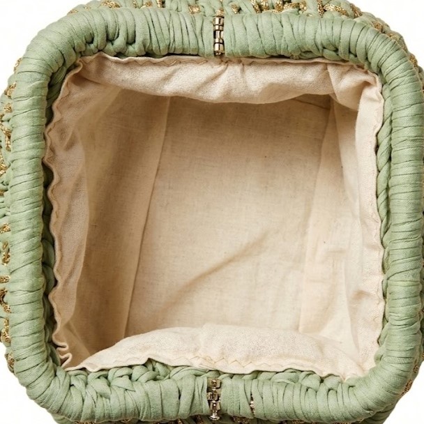 الخامات: مصنوعة من خيوط الكليم (خيط التيشرت) القطنية الناعمة، مدمجة مع خيوط السيرما الذهبية التي تمنحها بريقاً خاصاً.