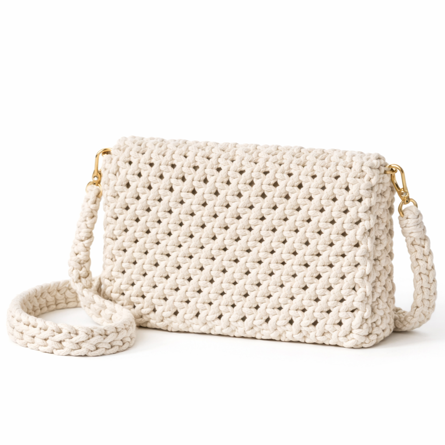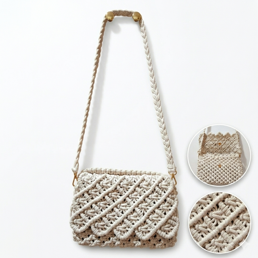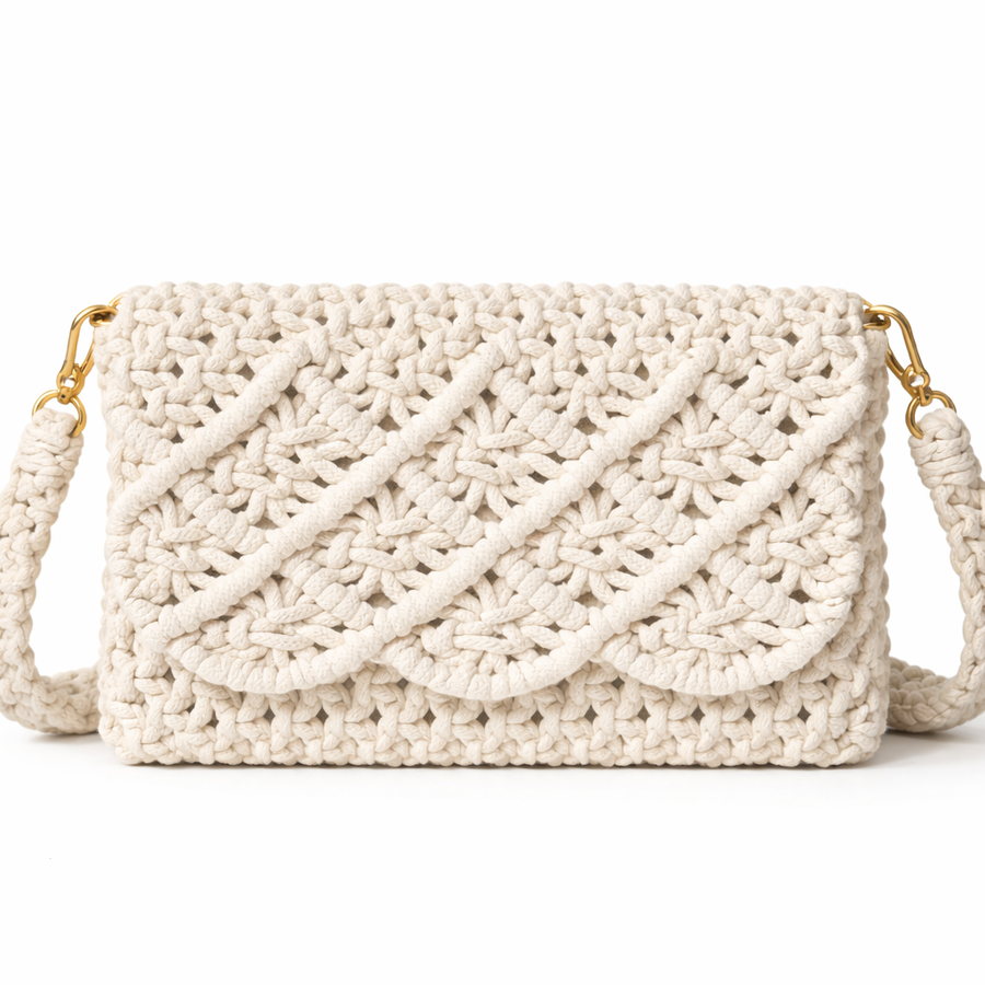 الخامات: مصنوعة يدوياً من خيط الكوردون "الحشو" الفاخر، الذي يتميز بقوام متماسك يحافظ على شكل الحقيبة وتفاصيلها لفترات طويلة.